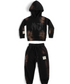 Black unisex hoodie & pants with a cool bleached effect. Features slouchy pants with a drawstring waist & the matching hoodie with a giant kangaroo pocket & the word “no!” in black on the front. A small care tag is on the left front of the pants and also the right sleeve.