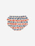 Feminine off white bloomers with and all over red and blue connected ribbon print. Features a ruffle around the waist for added touch of whimsy.
