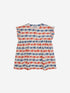 Feminine off white dress with an all over blue and red connected bows print. Features a thrree button opening at the front, empire waist and ruffle trimmed sleeves.