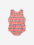 Cute pink romper with all over connected ribons print in boue and red. Features button front, cinched waist and buttons at bottom for easy dressing.