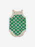 Soft cotton tank bodysuit with all over green and off white check print and tomatoes throughout. Features solid off white trim and button snaps at bottom for easy dressing.