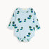 Adorable long sleeved baby bodysuit with a fun blue duck design and made from GOTS certified organic cotton which is internally brushed for extra warmth and softness. Press studs at the shoulder and crotch make dressing and diapering nice and easy. This sustainable baby bodysuit is perfect for winter layering.