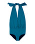 A beautiful halter one piece in deep teal. Features full open back and wide straps that can be be worn several ways; keep it simple by tying behind the neck or try other looks by crossing or knotting the straps in front before tying behind the neck.
