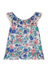 Gorgeous blue summer meadow floral all over printed top. Features delicate embroidery, ruffle trimmer neckline, low back with tassel trimmed tie string and loose fit through the body with an embroidered ruffle hemline.