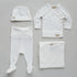 Super soft pointelle set to bring your baby home in! Includes wrap top, footie leggings, hat and blanket. Top features snap buttons and ribbon closures for easy dressing.