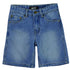 Denim shorts in a worn denim wash. Features two front and two back pockets along with a brown leather patch with a logo on the back. Made of 47% organic cotton, 46% cotton, 4% polyester, 3% viscose.