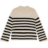 Beige and black striped knitted jumper in soft wool. The jumper has long trumpet-shaped sleeves, a loose fit, and a round neckline with ribbed trim. There are raw edges on the sleeves and at the bottom, as well as low shoulder seams. The jumper is soft and warm, perfect for colder days.