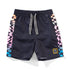 Cool black swim shorts with neon and black print down the sides. Features and elasticized drawstring waist and a back pocket.