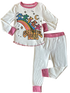 Silky soft pajama set. Top features rounded neck in pink trim, pink wrist cuffs, rounded hem with pink stitching and a colorful print of bears walking across a rainbow and the words "Grateful Dead" in yellow-orange. Pants have a pink waistband and cuffs.