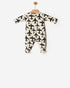 Cozy fleece lined jumpsuit. Features rounded neck, footies with hidden snaps up the legs, button snaps down the back and allover plane print on an off-white background.