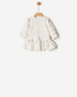 Cute winter white dress with silver stars. Features rounded ribbed neck, ribbed cuffs, dropped waist with a ruffle hem and brushed fleece inside for a cozy fit.