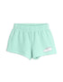 Short length aqua green sweatshorts with a white sneaker logo in white and white piping on the sides. Made of 100% organic cotton GOTS.