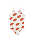 Adorable one piece with red lips print. Features cross back adjustable straps and the words "The Animals Observatory" with a small logo in contrasting navy.