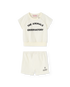 Unisex baby lounge set. Top features ribbed crew neck with two snap buttons for easy changing, raw edge sleeves with an athletic look, ribbed hem and "The Animals Observatory" written across the front in black block letters. The back features a smiley character with stars around it. Shorts features elasticized waistband and relaxed fit.
