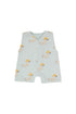 Cute duck print jumpsuit crafted from a soft organic cotton blend. It features a comfortable, relaxed silhouette with v-neckline, and snap openings on the front and bottom.