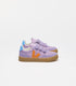 Cool purple with a pop of orange sneakers with triple velcro closure. Features a blue tab at back with The Campamento logo in white.