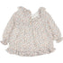 Double gauze fall print dress with a ruffle trim collar. Features elasticized wrists and a flared cut. Small wooden buttons at the back for fastening. Made from 100% Cotton. Spanish fabric. Made in Spain.