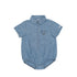 Collared chambray romper. Features rounded collar, decorative button pocket on the chest, hidden front snaps, elastic leg openings and snaps at bottom for easy dressing.