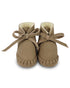 Cozy leather baby booties. Features faux fur lining, soft bottoms and leather laces for a secure fit.