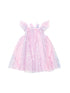 This dress is pure magic. Lined with super soft cotton and made with dreamy layers of pastel tulle with an allover cosmic unicorn iridescent print and delicate details like the frill sleeve and bow at the back.