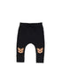 Organic cotton black crotch pants with cute digi tiger patches at the knees. Features drawstring waist and slightly tapered leg. Pair with the matching tiger top for a cute look.