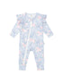 This buttery soft romper is made from all organic cotton with an all over floral print. Features sweet shoulder frills, two-way zipper for easy changes and a safety fold zip for peace of mind. Just add squishy legs.
