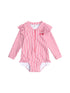 Getting ready for the beach is easy as in our zip up rashguard. This cherry stripe onesie is rated UPF 50+, which is the highest achievable sun protective rating for fabrics. Consciously crafted with recycled polyester, it features a zip for speedy changes, long sleeves for added protection and leg/sleeve frills, just for fun.
