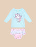 Two piece rashguard set with "mercorn" (mermaid unicorn) print on top and sea rainbow with gold foil daisy seashell print frill bottoms. Features glitter detailing on print and long sleeves for sun protection.