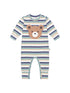 A marshmallow-soft striped romper with furry Huxbear applique on the front. Consciously crafted from premium organic cotton, it features stainless steel snaps at the shoulder and between the legs for wasy dressing. Just add squishy legs.