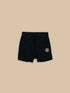 Soft cotton shorts in black with cute bear patch at left bottom. Features elasticized waist and drawstring.
