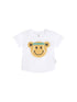 Super soft, premium organic cotton jersey t-shirt with tennis bear applique, size 6-12 months has stainless steel snaps at shoulder opening. Made from GOTS certified organic cotton.
