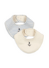 Set of two soft bibs one solid and one striped both with a cute design on the front. Made of 95% organic cotton and 5% elastane. Features a snap button closure with three adjustment levels.