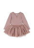 Long-sleeved ballerina dress with puff sleeves and layered tulle skirt.