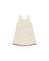Beautiful natural colored a-line tank mini dress in a pretty crochet. Features a scalloped contrast hemline.