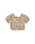 Pretty floral blouse with ruffle trim neckline. Features button front, slightly short length and elasticized arms and hemline. Pair with the rust mini skirt or bloom tiered mini for a put together look.