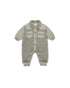Ultra cozy shearling jumpsuit for baby with denim contrast details. Features a collar, two chest pockets and brass buttons down the front.