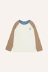 Cute color block t-shirt. Features blue crew neck, ecru sleeves and small Campamento logo on left chest.