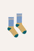 Cute multicolor socks. Features a light blue top with cream stripes, yellow bottom and green toe and heel. "the campamento" is written in blue on the sole.