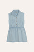 Lightweight denim dress. Features a lapel collar, wood button front closure, two front pockets, cinched waist and a flowy bottom. Left pocket has a stitched logo in contrasting white.