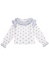 Long sleeved blouse with blue embroidered voile with ruffle detail on wrist, shoulders and neck. Features button closure at back of neck for easy dressing. Pair with the Lola Pant for a chic look.