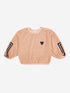 Sweet blush velour sweatshirt with a deep blue heart on the left and deep blue stripes. Pair with the matching pants for a sweet set.