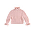 Pretty blush colored feminine sweater with a beautiful texture and ruffle details. Features a button closure at the back of the neck. Pair with our Moldavia leggings for a cozy look.