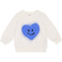 White sweatshirt with a spray effect blue heart with smiley face. Made from 100% cotton. Features a round neck with a rib edge, ribbing at the sleeves and bottom, plus an easy snap closure at the back left of neck. Pair with the matching Simeon joggers for the perfect look.