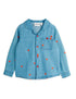 Adorable chambray denim collared shirt with all over tiny hearts embroidery. Features a small pocket on left chest.