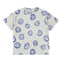 Pale grey T-shirt with short sleeves and a ribbed neckline. The T-shirt has a loose fit and a blue print of faces with different expressions. Made of soft organic cotton