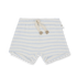 Soft terry shorts. Features elasticized waistband, cute tie detail with leather look tips and allover light blue stripes. Pair with the matching top.