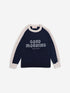 Deep navy knit sweater with ivory trims. Features text "good morning" on front and solid back.