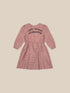 Dusty pink dress with thin blue and red grid all over. Features hidden zipper at back, cinched waist and black text at front "Lost Things Recollector." 50% cotton, 50% viscose.