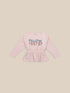 Adorable pale pink sweatshirt with cute text at front "Pillow Tester." Features loose fit, cinched waist, peplum bottom. Pair with our Bi Color Leggings for a chic look. 96% organic cotton, 4% elastane for stretchy comfort.