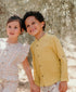 Honey colored mock neck shirt. Features wooden buttons, contrast interior, front pocket and button tabs for keeping rolled sleeves up. For baby boys pair with our adorable Louise Misha Abaya Bloomers. 100%